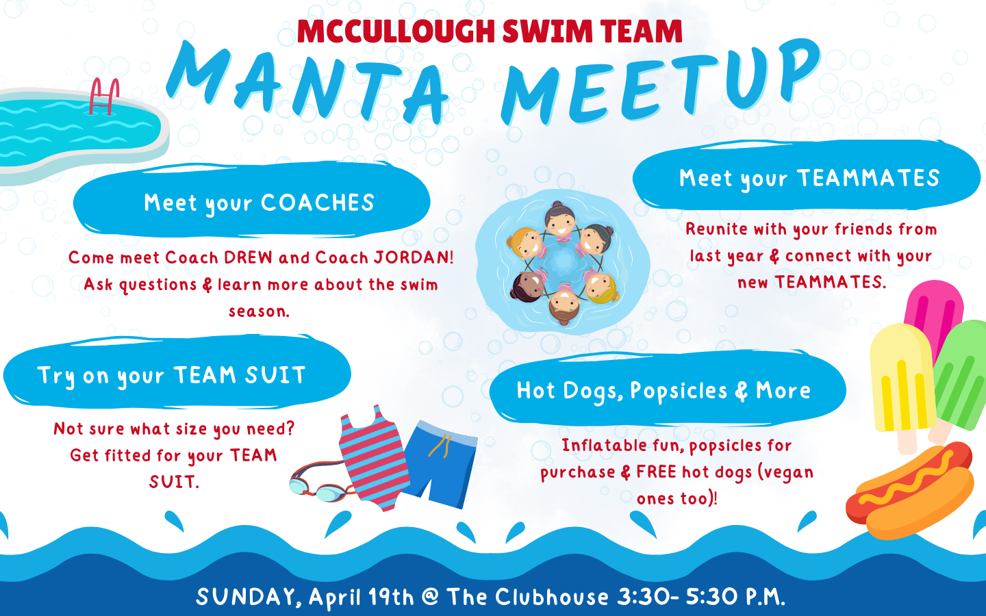 Come out for an evening of fun, food, and swim team spirit! You’ll have a chance to meet our coaches, connect with good friends and make some new ones.